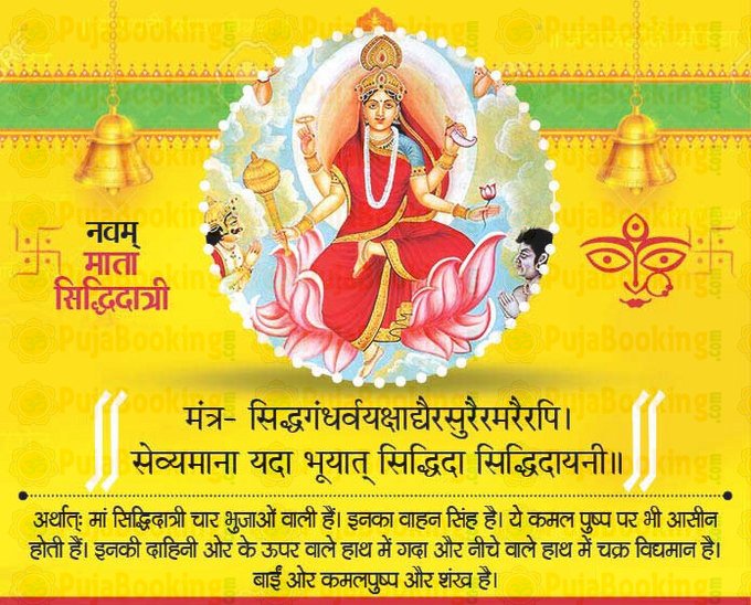 नवरात्रि के नौवें दिन दुर्गा के नौवें स्वरूप मां सिद्धिदात्री की पूजा और अर्चाना का विधान है.जैसा कि इनके नाम से स्पष्ट हो रहा है कि मां सभी प्रकार की सिद्धी और मोक्ष को देने वाली हैं.मां सिद्धिदात्री की पूजा देव, यक्ष, किन्नर, दानव, ऋषि-मुनि, साधक और गृहस्थ आश्रम में जीवनयापन करने वाले पूजा करते हैं.नवरात्र के अंतिम दिन मां की पूजा पूरे विधि-विधान के साथ करने वाले उपासक की सभी मनोकामनाएं पूरी हो जाती हैं. साथ ही यश, बल और धन की भी प्राप्ति होती है.